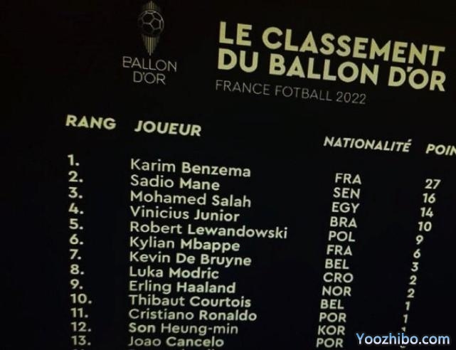 第4至第10名分别是“小熊”、莱万、姆巴佩、德布劳内、莫德里奇、哈兰德和库尔图瓦。第11位则是葡萄牙巨星C罗,他力压英超金靴孙兴慜,亚洲一哥排名第12,曼城边卫坎塞洛则位居第13位。