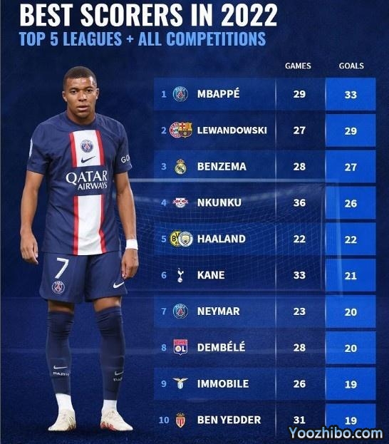 24直播网讯 北京时间09月13日 ,德国转会市场盘点了五大联赛球员2022年射手榜,姆巴佩33球居首,莱万27球位列第二,本泽马排名第三。