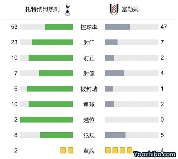 全场比赛结束,热刺2-1富勒姆。