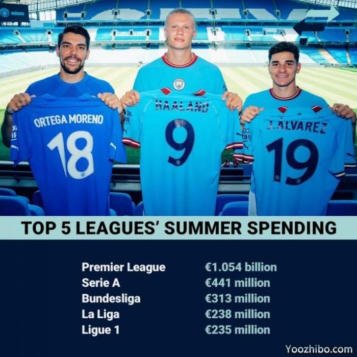 24直播网07月15日讯 根据统计,英超20队今夏在转会窗中已花费10.54亿欧元,接近其他四大联赛消费之和(12.27亿欧元)。