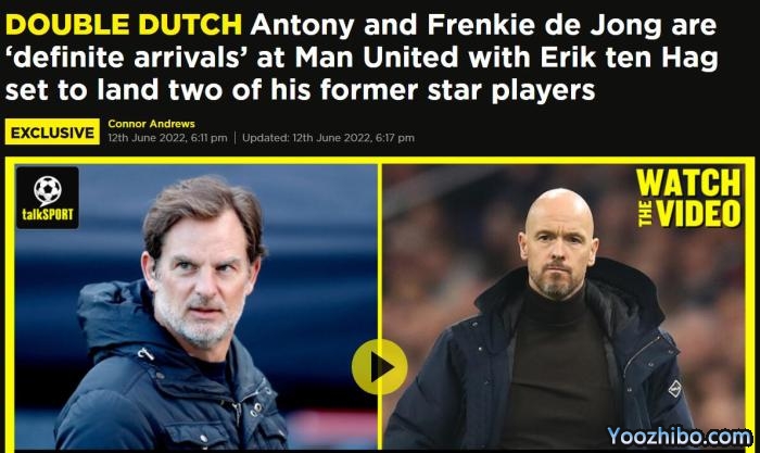 英国「talkSPORT电台」报道称,曼联今夏签下安东尼和另一位前阿贾克斯球员弗兰基·德容,成事概率极高(Antony and Frenkie de Jong are ‘definite arrivals’ at Man United)。
