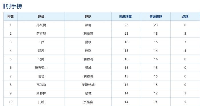 其余比赛中,热刺5比0大胜,孙兴慜梅开二度,他和萨拉赫并列拿到金靴,热刺也拿到了欧冠参赛资格。阿森纳最后一场是5比1大胜,但还是只能排名第5位,参加欧联杯的比赛。曼联0比1输给水晶宫,他们幸运守住第6的位置,下赛季可以参加欧联杯的比赛。