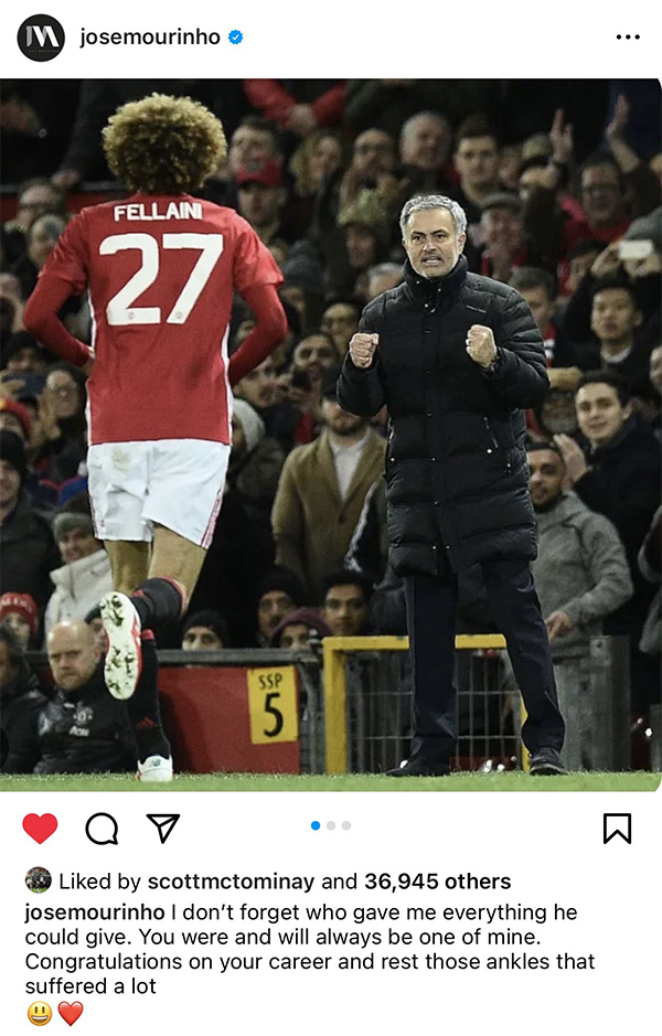 在费莱尼宣布退役后,曾在曼联与之合作的穆里尼奥亲自向其致敬。在自己的账号上,穆帅发布了与这名比利时国脚的庆祝进球经典合影,并且表示:「我永远不会忘记一个为我拼尽全力的人,你过去是,以后也永远是我的球员。祝贺你辉煌的职业生涯,现在让你受尽折磨的脚踝好好休息吧。」