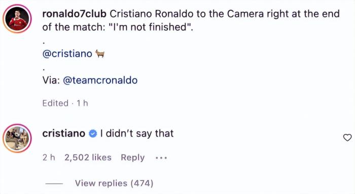 C罗则否认自己在比赛结束后说「我还没完」。当时,他向老特拉福德的曼联球迷挥手和鼓掌致意,并在镜头前说了一句话,人们根据口型判断似乎是「I’m not finished」。然而,C罗在社交网站上明确表示:「我没有那么说。」