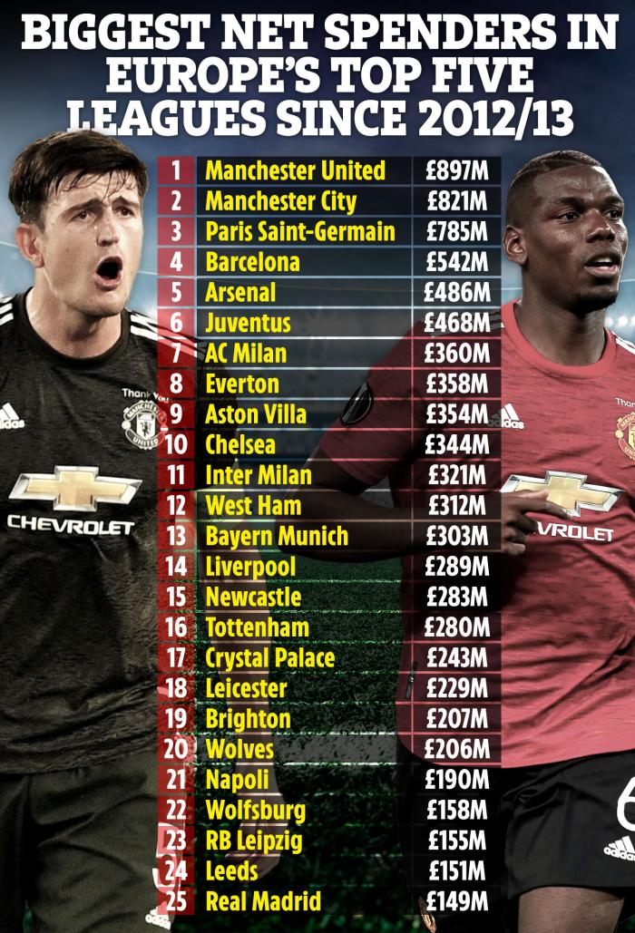 曼联的转会支出,在减去卖人收入后,仍然高达8.97亿英镑,领先曼城的8.21亿,高居榜首。巴黎圣日耳曼以7.85亿排名第三,后面的巴萨5.42亿、阿森纳4.86亿,已经远远低于前三甲。