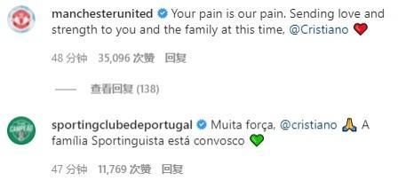 曼联官方评论道:“你的痛苦就是我们的痛苦。在这一刻,向你和你的家庭传递爱和力量。”