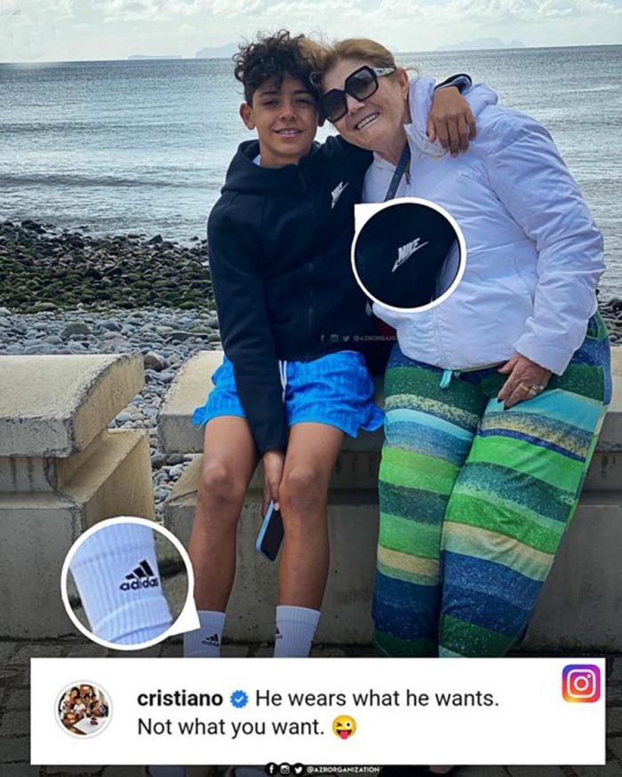 在一张照片中,迷你罗身上穿着耐克T恤,但脚下却蹬着阿迪达斯的袜子。众所周知,C罗是耐克的头牌球星,因此有人指责迷你罗混穿不同品牌的举动,对此C罗公开表示:「他按照自己的意志穿着打扮,而不是你们的意愿。」