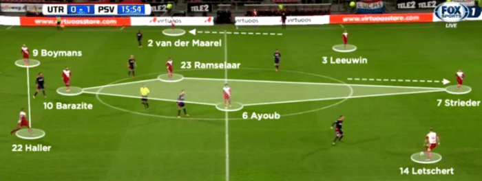 在10号位位置上,范德贝克通过自己的灵活跑位,尤其是向右侧跑位,弥补齐耶赫内切后的宽度,并为塔迪奇的进攻创造空间,同时也确保左侧边锋和边卫获得空档。