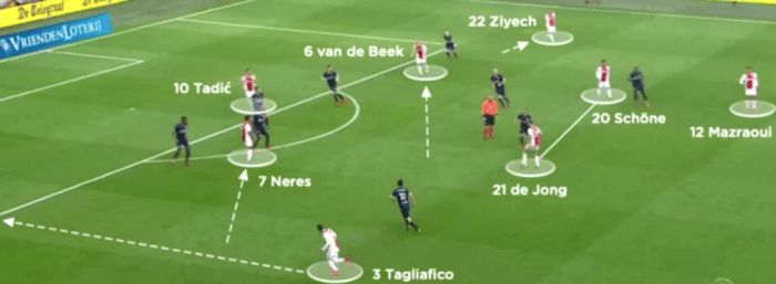 到了阿贾克斯,他的阵型是433和4231之间的综合体。在范德贝克效力期间,他的位置就是介乎4231中的10号位,或者433中的突前中场。在他身后是如今巴萨的弗兰基·德容和老将拉塞·舍内,在他前方,欧冠通常是内雷斯、塔迪奇和齐耶赫,荷甲则是齐耶赫、多尔伯格或亨特拉尔和塔迪奇。