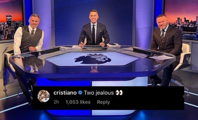 节目后鲁尼晒出了自己与卡拉格的合照,而C罗则评论:“两个嫉妒的人。”