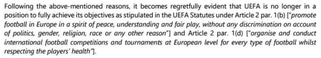 正因为此,俄罗斯足协决定向CAS上诉国际足联、欧足联。俄罗斯足协认为欧足联此举可能违背其宗旨和条例,即“促进欧洲足球体现和平的精神,理解和公平竞争,没有任何偏见”以及“在尊重球员健康的前提下,组织和举办各类欧洲级别国际足球比赛和锦标赛”的宗旨和条例。