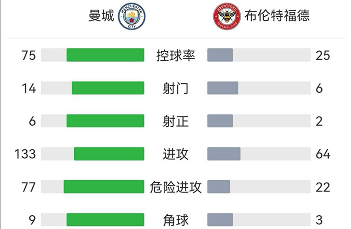 全场比赛结束,曼城2-0布伦特福德。