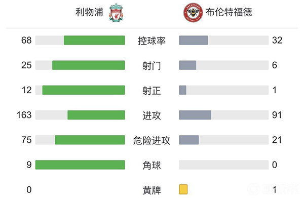 全场比赛结束,最终利物浦3-0战胜布伦特福德。