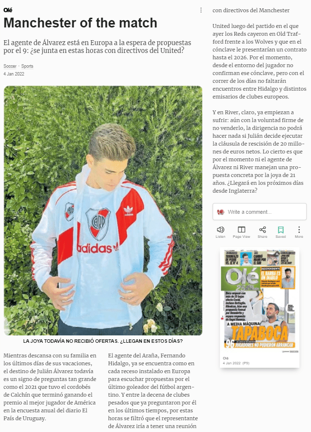 曼联同意一次性付钱,这让他们击败了意甲的国际米兰、AC米兰和佛罗伦萨等对手。在阿根廷,《奥莱报》也证实,在上轮0-1不敌狼队的比赛后,曼联俱乐部官员会晤了阿尔瓦雷斯的经纪人,并且拟定好了球员的合同,预计其合同期将到2026年。
