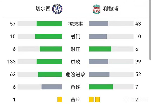 全场比赛结束,切尔西2-2利物浦。