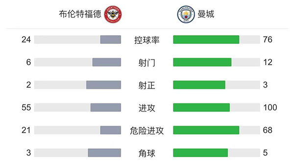 全场比赛结束,曼城客场1-0小胜布伦特福德。