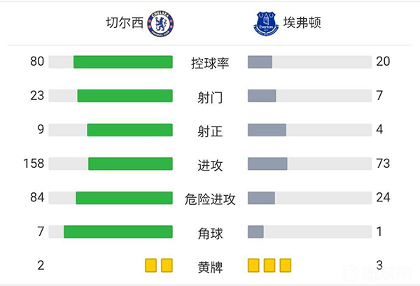 全场比赛结束,最终切尔西主场1-1战平埃弗顿。