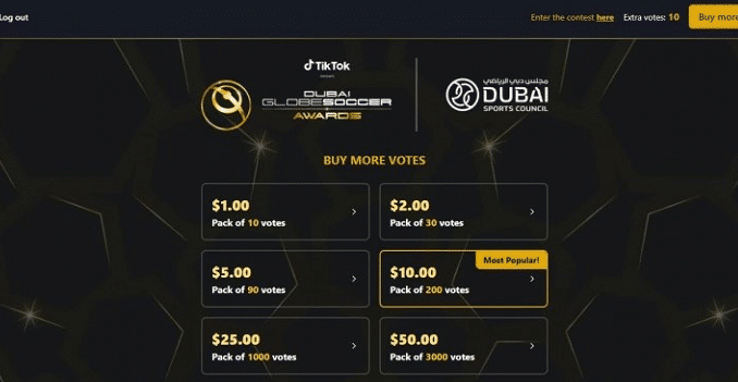 目前环球足球奖目前处于首轮票选阶段,通过官网可以看到,新注册之后就可以获得一张选票,还可以购买额外的票数:1美元10票、2美元30票、5美元90票、10美元200票、25美元1000票、50美元3000票。