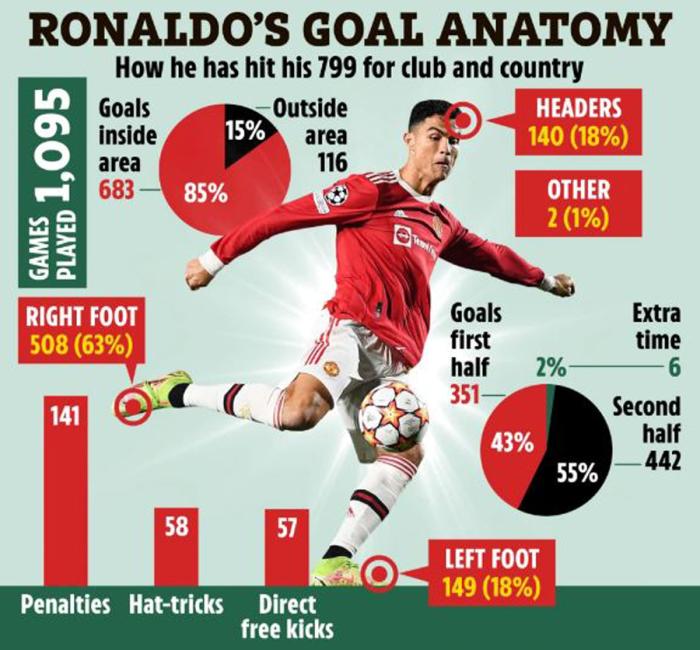 数据显示,C罗职业生涯面对切尔西15场,只有1球2助攻,场均参与0.2球,甚至不如从未在英超踢球的梅西,后者面对切尔西的10场比赛进了3球还有3次助攻。C罗职业生涯中,左脚打入149球,右脚破门508次,头球得分140次,其他部位也有2记进球,但面对切尔西,他只有一次头球冲顶入球,左右脚均未「开胡」。