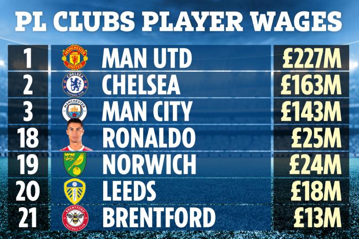 不仅如此,在英超,诺维奇、利兹联和布伦特福德3支球队,球员年薪总和都在2500万英镑之下,这意味着他们全队的总收入,还不如刚刚重返曼联的36岁巨星克里斯蒂亚诺·罗纳尔多一人。