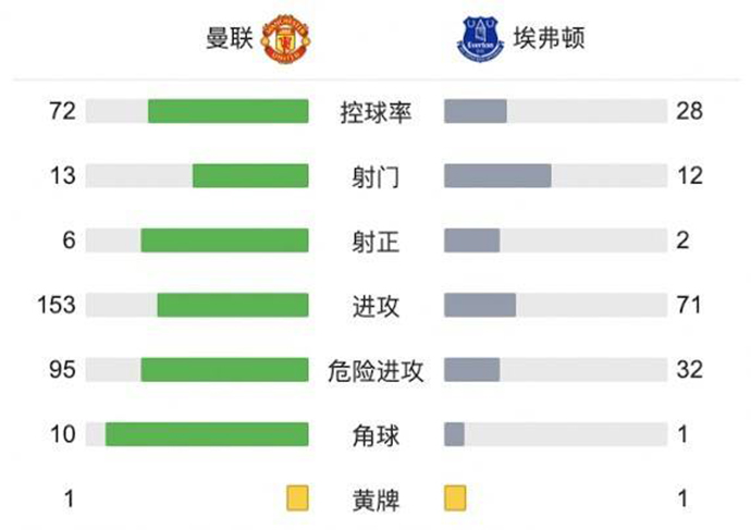 最终全场比赛结束,曼联1-1埃弗顿。