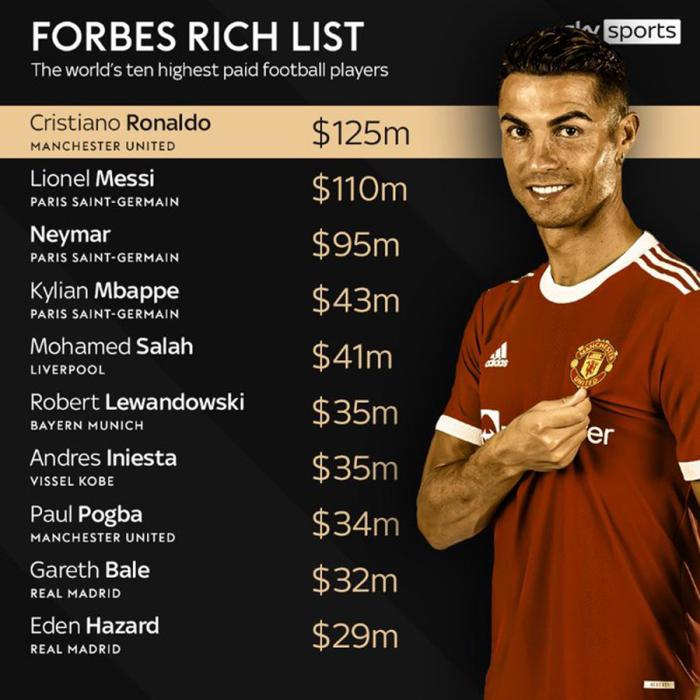据福布斯预测,在2021/22赛季期间,C罗将获得近1.07亿欧元的总收入,其中包括6000万欧元为来自曼联俱乐部的各种薪水、奖金、肖像费等收入,另外超过4000万欧元则来自个人代言的赞助和商业合同,包括他自己的「CR7」品牌,这也不难理解为何中国球迷戏称C罗为「总裁」。