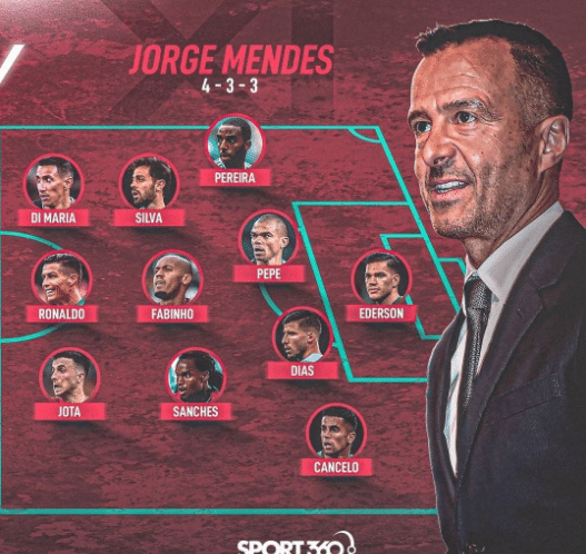 而门德斯旗下球员的最佳阵容是433阵容,门将位置上是曼城的埃德森;后防线上迪亚斯和佩佩搭档中后卫,佩雷拉和坎塞洛踢两个边后卫;而三中场组合是桑谢斯、法比尼奥和贝尔纳多席尔瓦;前场三人组是C罗居中,若塔和迪玛利亚在两侧。不得不说,门德斯的最佳阵容配合更好,因为里面的球员几乎都是葡萄牙国家队的球员,他们可是经常在一起踢球的。