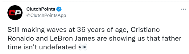 来源:24直播网09-12 11:1624直播网9月12日讯今日,美媒ClutchPoints晒出詹姆斯与足球超级巨星C罗职业生涯轨迹对比图,感慨两位传奇老将之间的一些惊人相似之处。ClutchPoints还配文写道:“36岁的克里斯蒂亚诺-罗纳尔多和勒布朗-詹姆斯仍在掀起波澜,他们告诉我们,时光老人并非不可击败。”