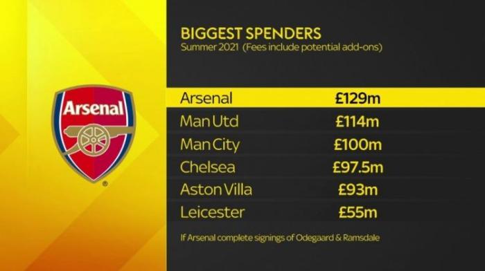 24直播网讯 由于阿森纳即将签下厄德高和拉姆斯代尔,因此,有媒体统计,如果加上这两笔交易的转会费,阿森纳今夏的转会支出将达到1.29亿英镑,位列英超球队第一。