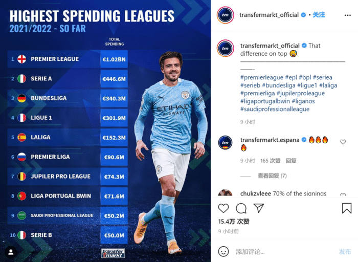 24直播网讯 德国转会市场今天统计了这个夏季转会窗各个联赛的烧钱情况,英超以10.2亿欧元排名第一。