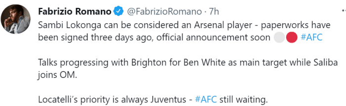 罗马诺写道:“洛孔加已经是阿森纳球员了,双方在三天前签约,交易很快官宣。萨利巴将被租借到马赛,现在阿森纳将全力追求本-怀特,他们仍在于布莱顿进行谈判。”