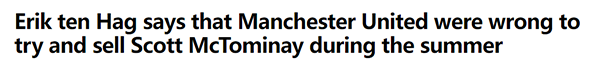 在曼联阵中,麦克托米内同样以6球排在射手榜第一。他让顽固的滕哈格不得不承认错误,同意在夏天试图出售麦克托米内是错误的决策。幸亏曼联转会部门没有成功,否则滕哈格一定会后悔,他将失去一名挽救他的功臣。