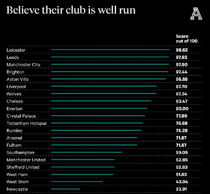 上图是俱乐部球迷对球队运营情况的满意度,其中莱斯特城球迷对球队最满意,有98.62%的球迷对球队运营感到满意。第二是利兹联,97.92%的球迷满意球队的运营。第三是曼城,97.9%的曼城球迷对球队运营满意。六强其他球队利物浦排名第六,满意度是87.7%,切尔西排名第八,满意度是83.47%,热刺排名第11,满意度是76.68%,阿森纳排名第13,满意度是71.57%,曼联排名第16,满意度是52.85%。