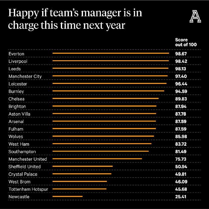 来源:24直播网04-02 15:3924直播网讯 本赛季即将过去了,而英超的最终排名也快要确定了,这种情况下权威媒体The Athletic也开始发起了一个问卷调查,他们对本赛季英超各球队球迷对球队的满意度、主帅的满意度、下赛季夺奖信心的满意度、俱乐部运营情况的满意度、过去一年转会操作的满意度和球队比赛精彩程度进行了调查,具体情况如下: