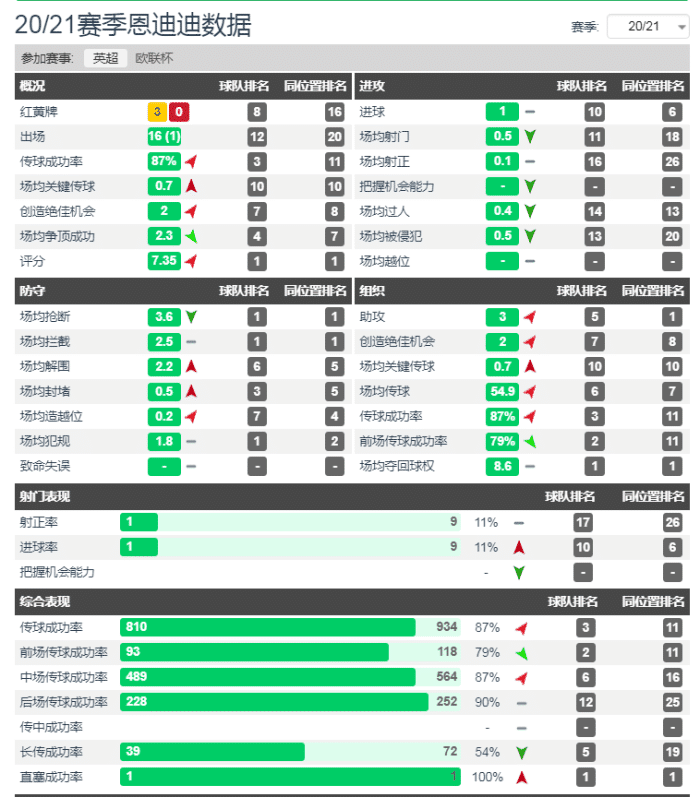 恩迪迪被认为是坎特之后,莱斯特城最好的后腰,甚至不少人认为恩迪迪就是坎特的接班人。具体数据来看,恩迪迪场均抢断3.6次,场均拦截2.5次,场均解围2.2次,场均封堵0.5次,场均争顶成功2.3次,场均夺回球权8.6次,而他的传球成功率是87%。从数据来看,恩迪迪的防守能力比前两位要强了不少,不过恩迪迪的长传转移能力更差,这是他的缺陷。