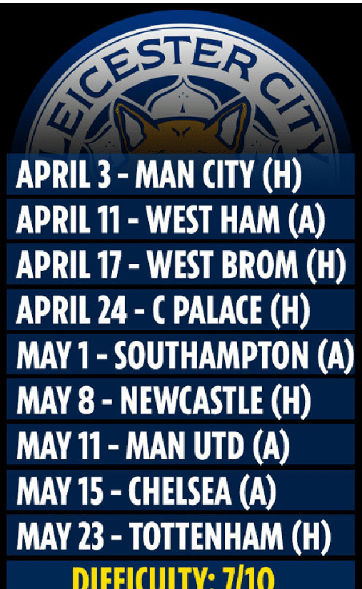 而莱斯特城的赛程也非常困难,说赛程之前先说说莱斯特城的情况,球队目前最大的问题就是伤病严重,许多主力都受伤了,这会极大的影响球队的竞争力。而赛程方面,莱斯特城要主场对阵曼城、西布朗、水晶宫、纽卡和热刺五支球队,同时还要客场对阵西汉姆、南安普顿、曼联和切尔西四支球队。可以说,后面的比赛没有一场好踢的。而上赛季莱斯特城就是最后阶段跌出前四的,不知道本赛季呢?