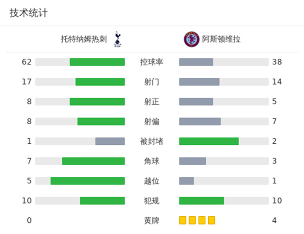 维拉2-1热刺 孙兴慜越位帽子戏法热刺吞3连败