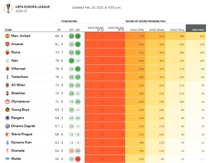 而夺冠几率方面,著名大数据网站“583预测了”十六支球队的夺冠几率,其中曼联夺冠几率是24%,是所有球队中最高的。而和赔率不同的是,欧联夺冠几率第二的球队不是热刺,而是阿森纳,他们夺冠几率是12%,而并列第三的是罗马和阿贾克斯,他们夺冠几率是10%,第五是比利亚雷亚尔和热刺,他们的夺冠几率都是8%。而第七是米兰和矿工的5%。