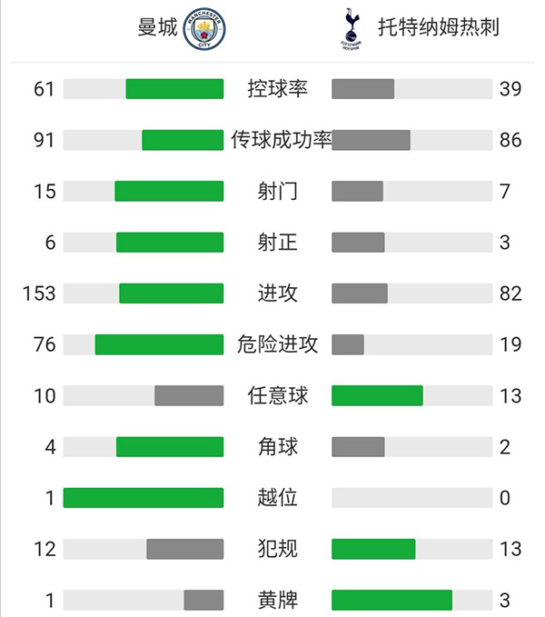 第49分钟,斯特林禁区左侧内切后斜塞,京多安插上一脚捅射入网,曼城2-0热刺!
