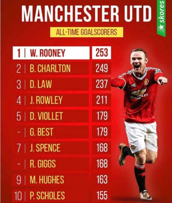 曼联方面,队史最佳射手是刚刚退役的鲁尼,他代表曼联打进了253球,而排名第二的是查尔顿爵士的249球,第三是丹尼斯劳的237球,随后是罗利的211球,维奥雷特和贝斯特的179球,斯宾斯和吉格斯的168球,马克休斯的163球和斯科尔斯的155球。看完曼联队史射手榜之后,不知道曼联球迷能够认识几个?