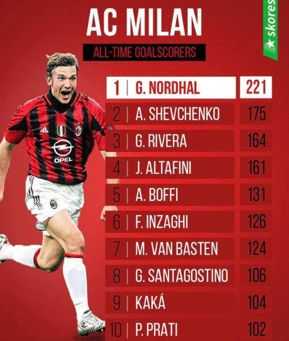 米兰也是欧洲传统豪门,他们的历史也非常悠久,他们队史最佳射手是诺达尔,他代表米兰打进221球,随后是舍普琴科的175球,里维拉的164球,阿尔塔菲尼的161球,博非的131球,因扎吉的126球,巴斯滕的124球,圣阿哥迪诺斯的106球,卡卡的104球和普拉迪的102球。里面最可惜的是巴斯滕,如果不是他因伤早早退役,他可以打进更多的进球。