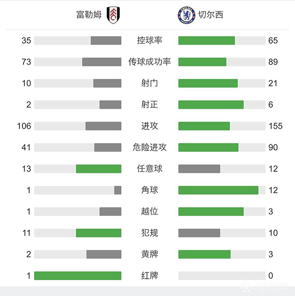 全场比赛结束,切尔西1-0战胜十人富勒姆。