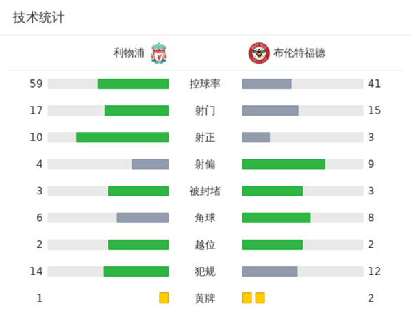 第39分钟,阿诺德直塞,努涅斯拿球再分给萨拉赫,后者小角度推射远角得手,利物浦1-0布伦特福德。
