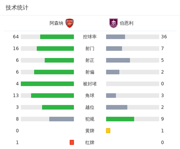 阿森纳3-1伯恩利 特罗萨德传射法维替补染红
