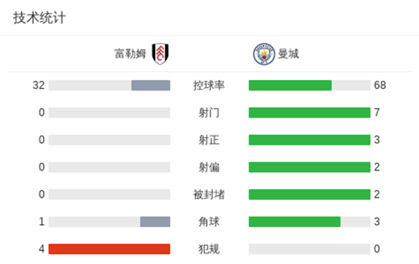 曼城4-0对富勒姆 反超阿森纳2分领跑 格瓦迪奥尔双响