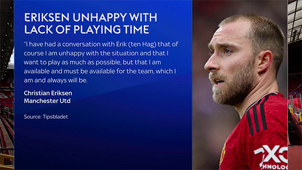 而埃神的昔日老东家阿贾克斯,则希望从曼联租借他。吉姆·拉特克里夫爵士的英力士足球管理团队不同意出租,因为那样等同于明年将免费失去埃里克森。虽然当年丹麦中场就是免费加盟的,但俱乐部现在财政存在挑战,自然希望能赚一点钱。