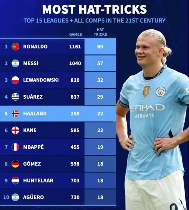 24直播网讯 《转会市场》统计了新世纪效力前15大联赛的球员各项赛事戴帽情况,C罗和梅西断层领跑。