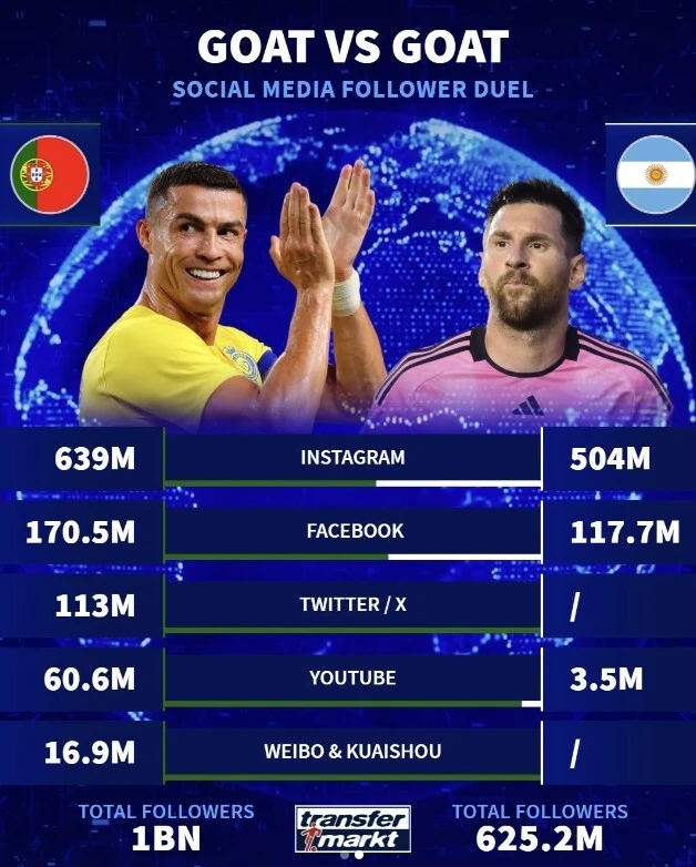德转盘点:C罗社媒粉丝破 10 亿,梅西三平台共6.25亿