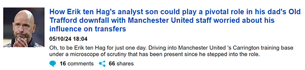滕哈格照顾自己的儿子已经不是第一次,他在荷兰执教阿贾克斯时,奈杰尔直接担任了贾府的球探。与滕哈格长相酷似的儿子,也多次出现在老特拉福德,尤其是夺冠之后。但其他经纪人也注意到了这一点,他们认为由于与滕哈格父子的关系,他们失去了一些潜在交易的机会,并对此感到不满。