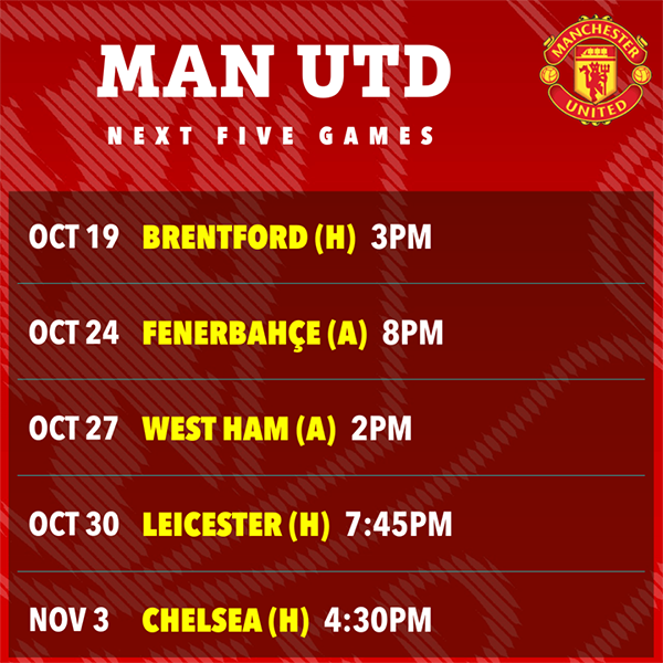 曼联在11月的国际比赛日之前还有7场比赛,从下周六的布伦特福德开始,他们还将面对西汉姆联、切尔西和莱斯特城的英超联赛,以及欧联杯对费内巴切和塞萨洛尼基,并在联赛杯再战莱斯特城。